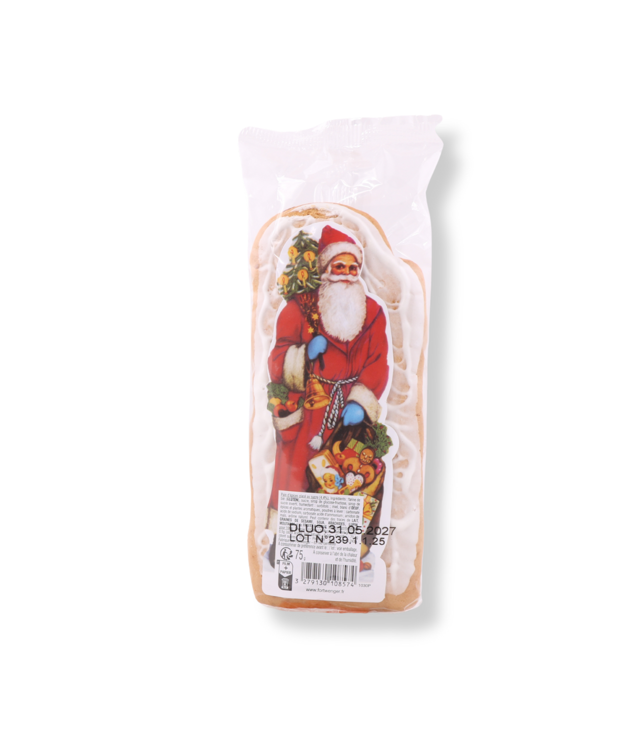 Depuis plus de deux siècles, Fortwenger cultive l’art du pain d’épices en Alsace. Cette version glacée, décorée à l’effigie du Père Noël, illustre parfaitement le savoir-faire de la maison : une pâte moelleuse, longuement travaillée, associée à un glaçage traditionnel appliqué avec précision pour obtenir un décor clair, net et entièrement comestible.