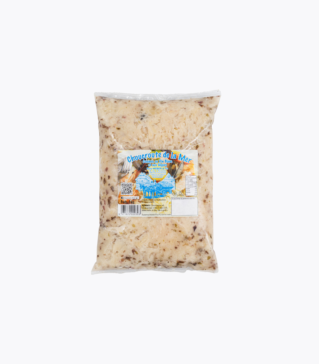 Conditionnée en sachet sous vide de 1 kg, cette choucroute est prête à être réchauffée et servie.