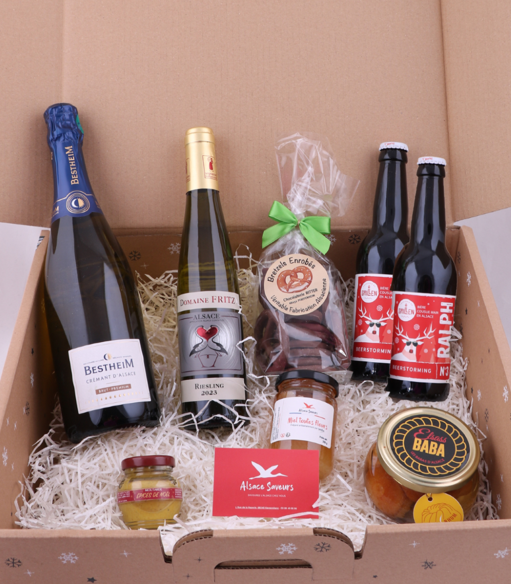 Un coffret élégant qui célèbre les vendanges et la convivialité alsacienne : vins, bières de Noël, douceurs sucrées et condiments de caractère, réunis pour une parenthèse festive pleine de charme.