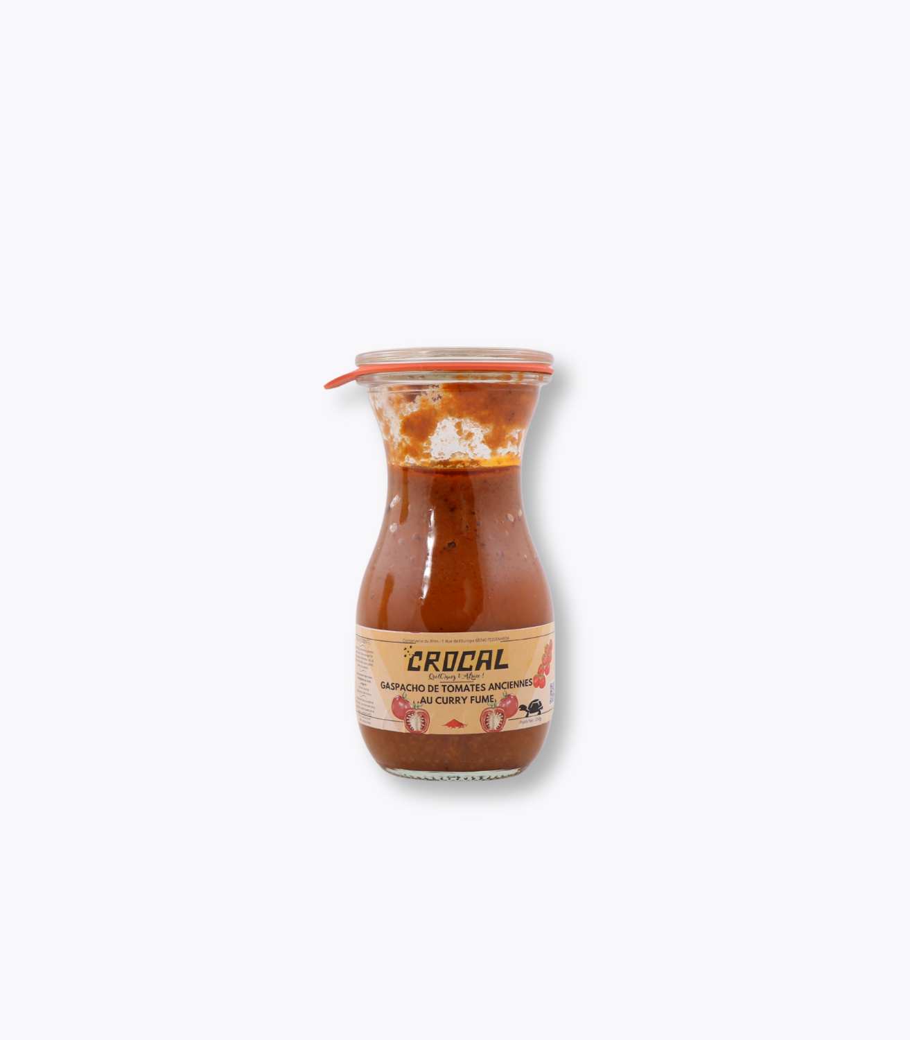 Le gaspacho de tomates anciennes au curry fumé révèle toute sa profondeur avec quelques dés de tomate fraîche, un tour de moulin à poivre ou une pointe de crème légère.