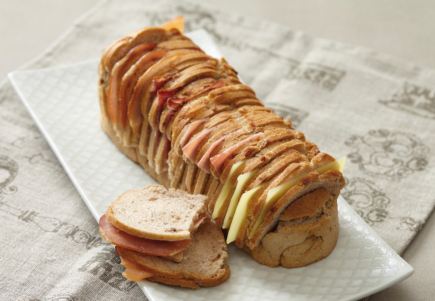 Pain long aux noix garni de bacon, saumon fumé, jambon cru de la Forêt Noire, jambon cuit, emmental.
